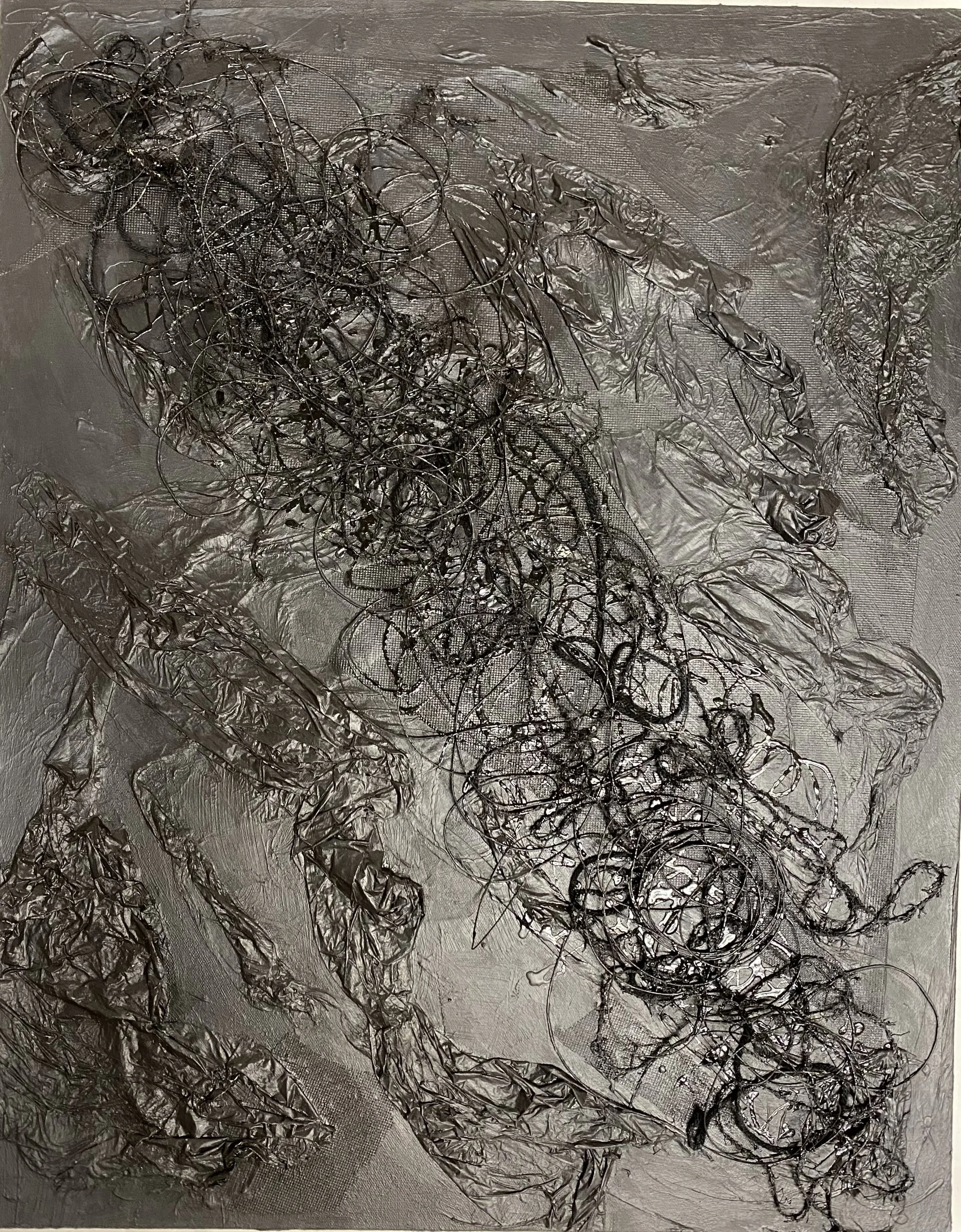 Beauty In Darkness is a monochromatic mixed media series created with a minimum of four layers of acrylic paint, yarn, plastic, mesh, ink, spray paint, leather, wire, and paper. The sentiment behind Beauty in Darkness is in its most literal and figurative terms. The perspective of Black Americans’ existence can be viewed as beautiful in our resilience and also ugly because of our societal mistreatment. We are beautiful and necessary. The textures and layers of the painting are an exaggeration of how we adorn ourselves in style and dress. The layers and the use of materials are examples and represent the spiritual and emotional depth of our existence.