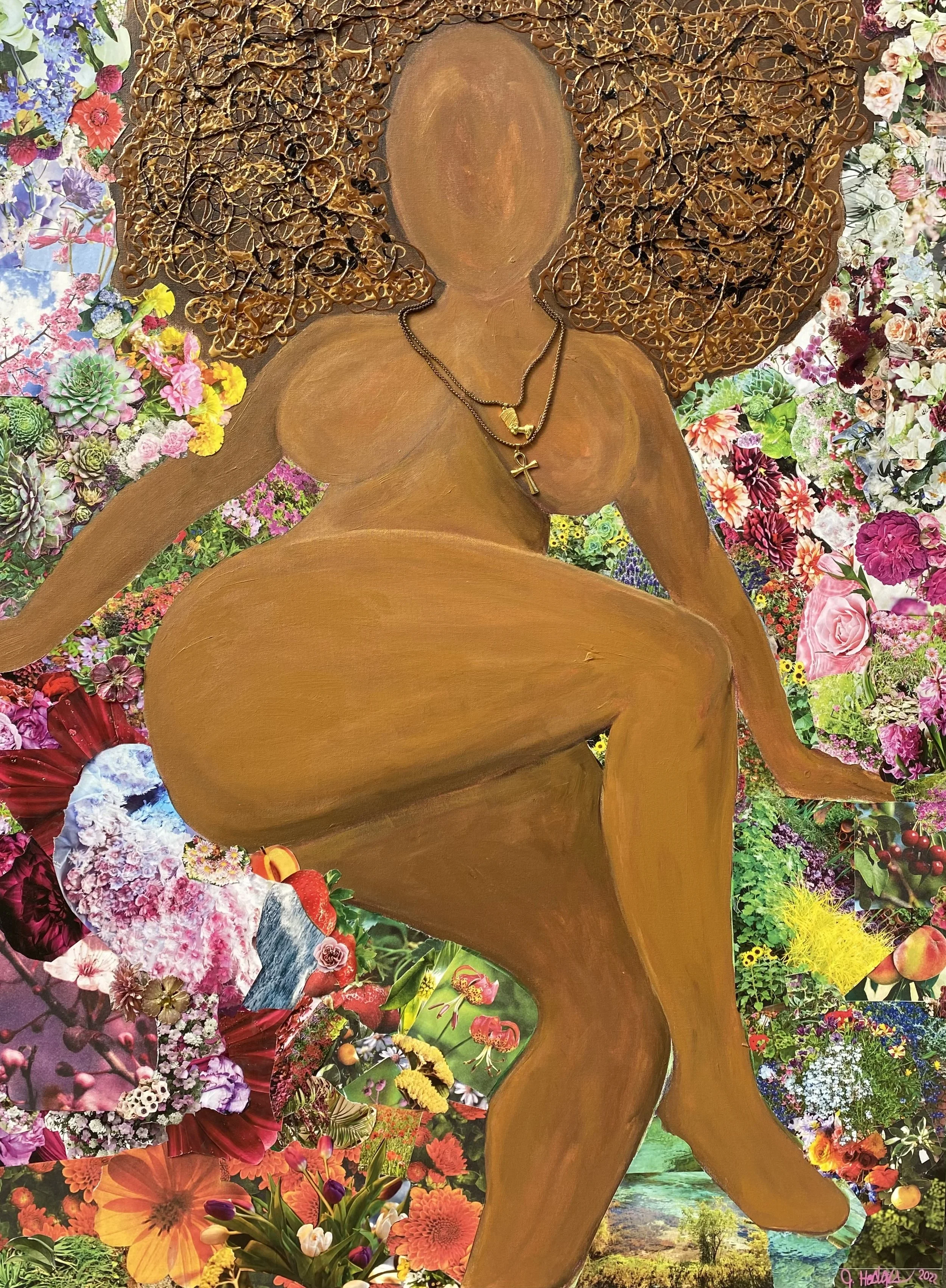 Divine Feminine is the embodiment of vulnerability, sensuality, spirituality, femininity, and power. She is sitting on a bed of flowers that hold her delicate nature, and she demonstrates her power and confidence. She is buxom and bouffant and beautiful. Her necklaces are metal the ankh and Nefertiti, which represent royalty and the key of life. She is hydrated, fruitful, one with nature, the key of life in her true honest form.